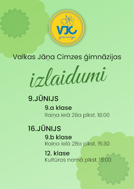 9. b klase - Raiņa ielā 28a, aktu zālē plkst. 15:30