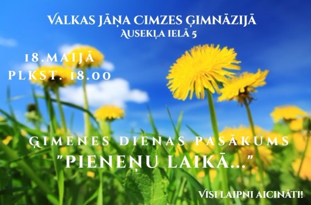 Aicinām visus 18.maijā plkst.18.00 uz ģimenes dienas pasākumu "Pieneņu laikā...". Tas notiks Valkas Jāņa Cimzes ģimnāzijā Ausekļa ielā 5.