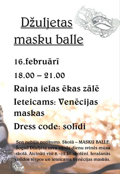 Skolā top brīnišķīgs notikums 8.-12.klašu skolēniem, t.i., 16.februārī plkst.18:00 sāksies Džuljetas balle. Tā ir plānota kā masku balle ar vakara vadītājiem - Romeo un Džuljetu -, dzīvo mūziku, priekšnesumiem, polonēzi un masku demonstrāciju.