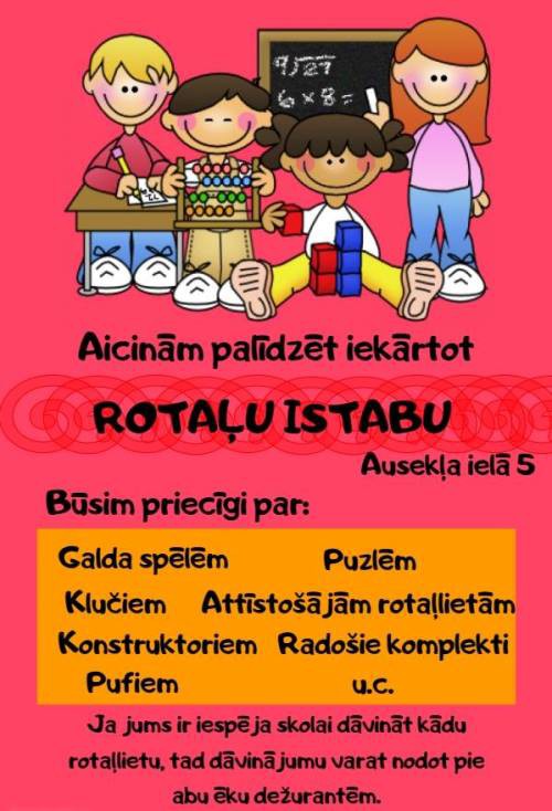 Mūsu ēkā esam iecerējuši izveidot Rotaļu istabu, kur sākumskolas skolēni pēc mācību stundām vai kādā citā brīvajā laikā varētu atpūsties.