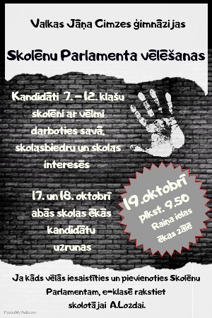 17. un 18.oktobrī abās ēkās notiks kandidātu uzrunas. Ja kāds vēlas iesaistīties un pievienoties SKolēnu Parlamentam, e-klasē rakstiet skolotājai Andrigai Lozdai.