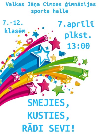 4.Noskaidrot aktīvāko, izturīgāko un sportiski draudzīgāko klases kolektīvu Valkas Jāņa Cimzes ģimnāzijas 7.-12. klasēs.