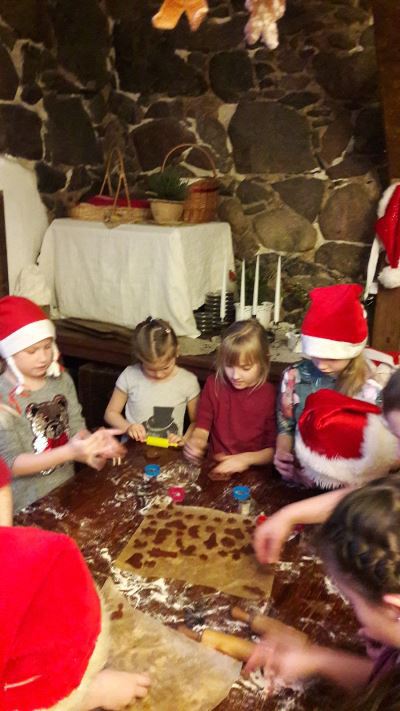 12.decembrī, neskatoties uz vējaino un lietaino laiku, 2.a, 2.b un 2.c klases skolēni kopā ar skolotājām devās uz Blomi – tur katru gadu darbojas Ziemassvēku rūķu piparkūku meistardarbnīca. Mūs sagaidīja jauka rūķenīte, kas uzreiz vedināja bērnus uzdziedāt, uzspēlēt spēles un kopā nofotografēties. Turpinājumā sekoja gan tikšanās ar vēl vairākām rūķu meitenēm, gan svinīgā solījuma došana (ko nozīmē būt īstam rūķim un uzvesties kā īstam rūķim), gan mīklu minēšana, gan rotaļas un tautasdziesmu salikšana no atsevišķām rindiņām. Tomēr pats gaidītākais notikums – piparkūku cepšana bija īsts piedzīvojums! Virtuve šajā brīnišķīgajā mājā atrodas pagrabstāva, tā ir piepildīta ar maigu siltumu, jo tajā atrodas īsta maizes krāsns, ar jaukām smaržām un darbīgu noskaņu. Tiklīdz bērni bija ieņēmuši vietas pie galdiem, sekoja piparkūku mīklas saņemšana, tās sastāvdaļu minēšana un stāsts par to, kur tad pirmo reizi atrastas piparkūkas. Izrādās – Ēģiptes piramīdās! Pēc tam – sīka pamācība, kā un kas darāms, lai taptu piparkūkas. Bērni ķērās pie darba – rullēja mīklu, izspieda to ar dažādām formiņām, pārklāja gatavās figūriņas ar noslēpumainu vielu, kas saucā „ollallā!”, izrotāja tās arsēklām un riekstiem. Pēc tam piparkūkas aizceļoja uz cepeškrāsni. Gaidot izcepamies cepienu, katrs pagatavoja savu gan formas, gan rotājumu ziņā īpašo piparkūku. Un tad jau nogaršošana – kopā ar pienu garšoja lieliski! Rūķi bija sarūpējuši arī gardu zupu, kurai katrs varēja klāt ēst rupjmaizi. Pēc tam, ielikuši katrs savu autordarbu īpašā turziņā un aizsējuši ar īpašu aukliņu, teicām rūķiem lielu paldies un atvadījāmies no siltās, gaišās un viesmīlīgās mājas Blomes „Donās”.